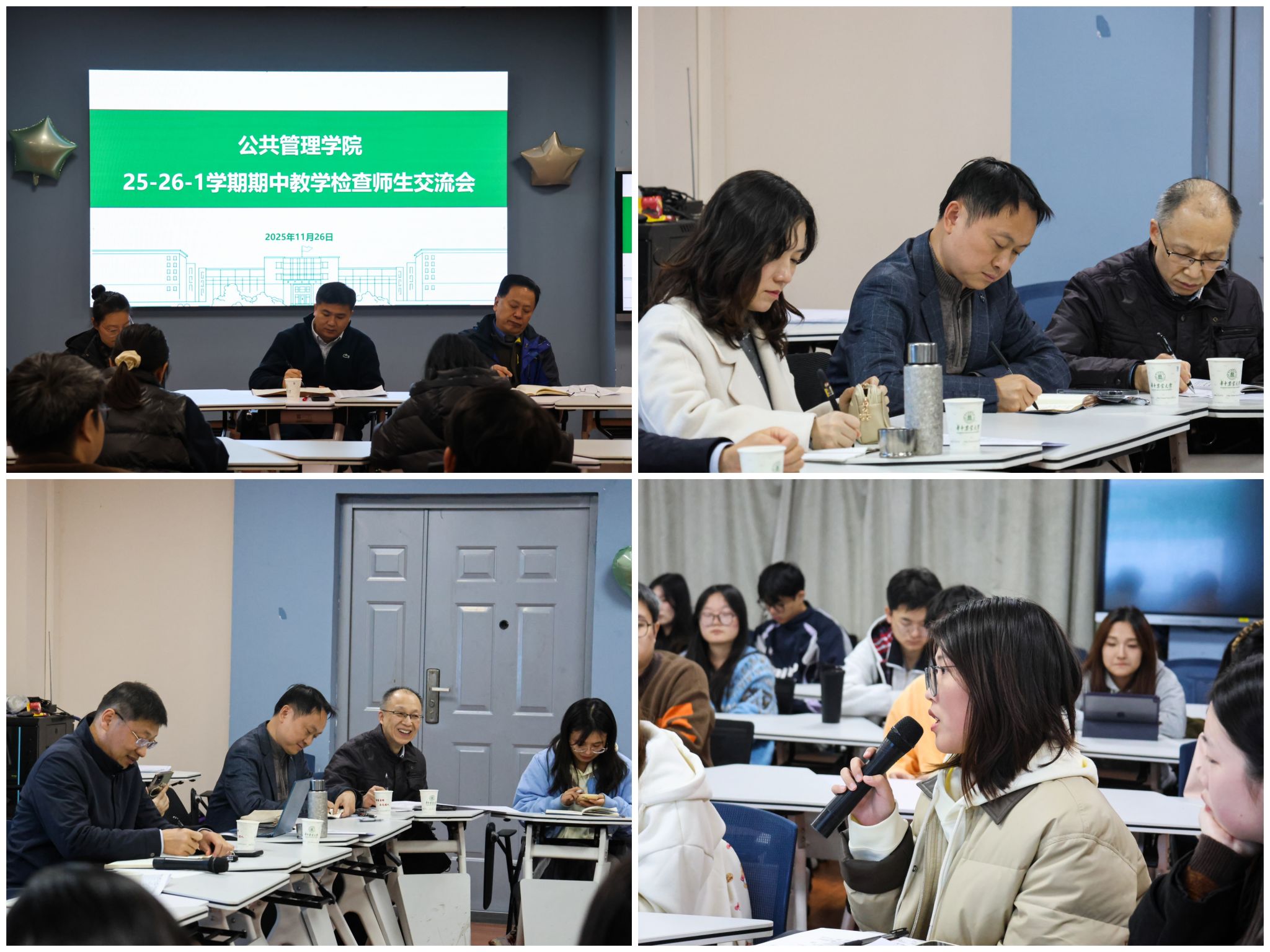 11月26日下午,学院在人文楼M221举行期中教学检查师生交流会。本科生院思想政治教育管理处处长周雷、学院副院长汪文雄、副书记罗晓峰、教学督导员任宇华和陈中江、各系主任、支部书记、辅导员、教学秘书及各年级学生代表共同参会,围绕教、学、管、服四方面展开交流。